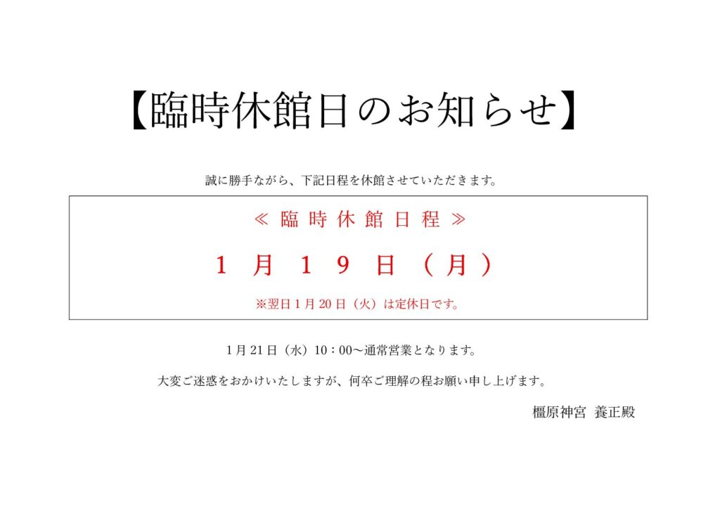 1月19日(月)養正殿宴会婚礼予約・Café橿乃杜   臨時休館のお知らせ